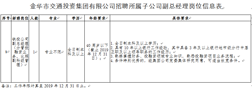 2.資格條件。詳見《金華市交通投資集團有限公司招聘所屬子公司副總經(jīng)理崗位信息表》。